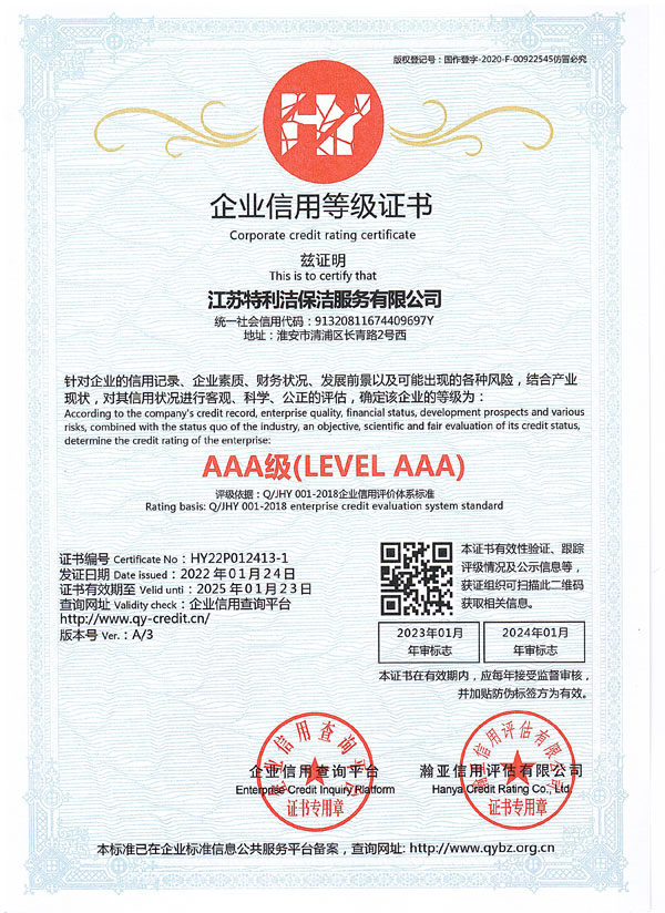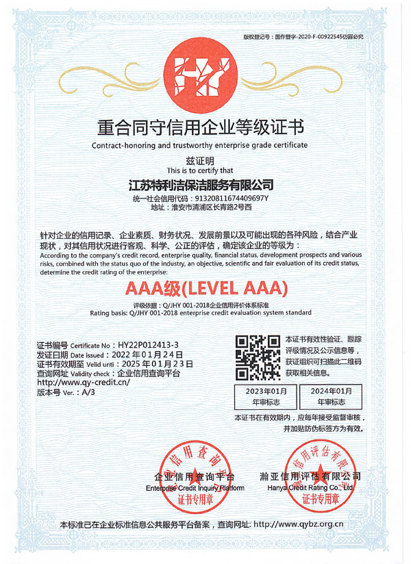 江蘇特利潔保潔服務(wù)有限公司(前稱為淮安市特利潔保潔服務(wù)有限公司),成立于2003年,于2018年經(jīng)工商變更登記為“江蘇特利潔保潔服務(wù)有限公司”,是經(jīng)工商部門登記注冊的合法企業(yè)。公司員工經(jīng)系統(tǒng)培訓(xùn)后上崗,本公司全部采用特利潔專業(yè)清洗設(shè)備、藥劑,并秉承了特利潔先進的管理模式,具備了專業(yè)的清洗技術(shù)、服務(wù)和網(wǎng)絡(luò)優(yōu)勢以及一批訓(xùn)練有素的專業(yè)清潔隊伍及管理人員,致力于推動淮安清洗行業(yè)朝著規(guī)范化、專業(yè)化、標(biāo)準(zhǔn)化方向發(fā)展。公司成立至今,經(jīng)過我們?nèi)w員工的不懈努力,以及本著“誠信、專業(yè)、周到”的服務(wù)使得接受過我們服務(wù)的每一位客戶均能成為我們的長期合作對象。公司也從起初十幾名員工的小公司逐漸發(fā)展壯大,現(xiàn)已初具規(guī)模,并在保潔行業(yè)當(dāng)中占據(jù)一定份額。現(xiàn)與恒大集團等世界500強企業(yè)建立戰(zhàn)略合作。2018年10月公司取得三A信用評級、三A重合同守信用單位...
